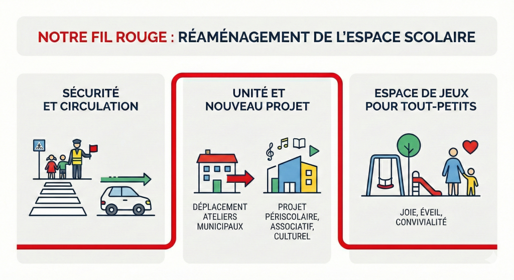 Afin d’apporter une unité cohérente et harmonieuse à la zone scolaire, nous envisageons le déplacement des ateliers municipaux. Cette réorganisation permettra de réaffecter les locaux à un projet structurant à dimension périscolaire, associative et culturelle.